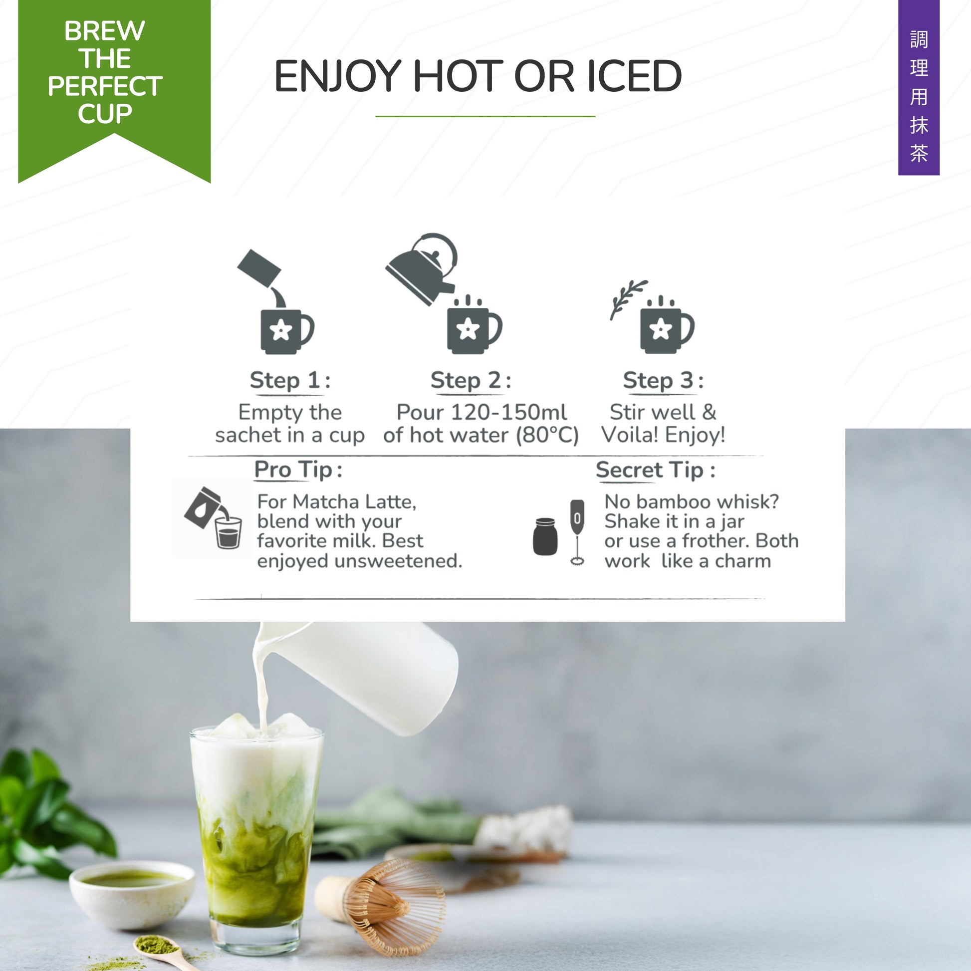 Chaque sachet est pré-portionné, scellé pour préserver la fraîcheur et protégé de la lumière - conservant ainsi la couleur, la puissance et la saveur intactes jusqu'au moment de l'ouverture. Notre procédé MicroMill™ broie les feuilles en particules ultra-fines, de sorte que la poudre se mélange en douceur sans grumeaux. Pas de tamisage, pas de fouet, pas d'étapes supplémentaires.